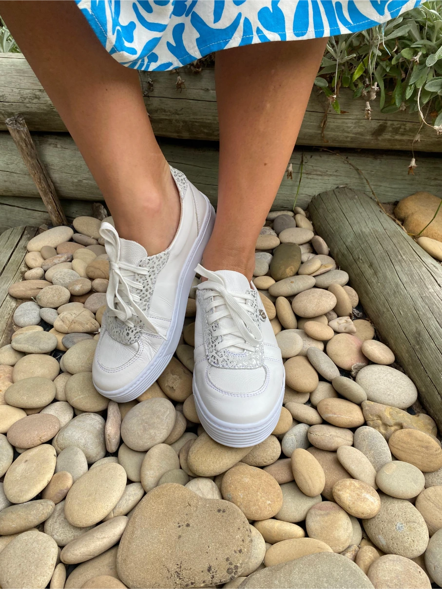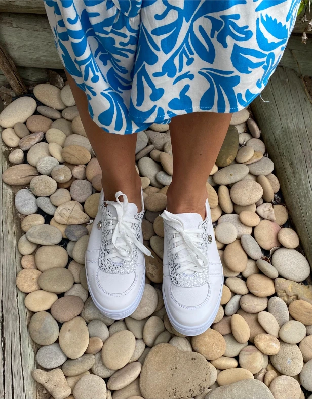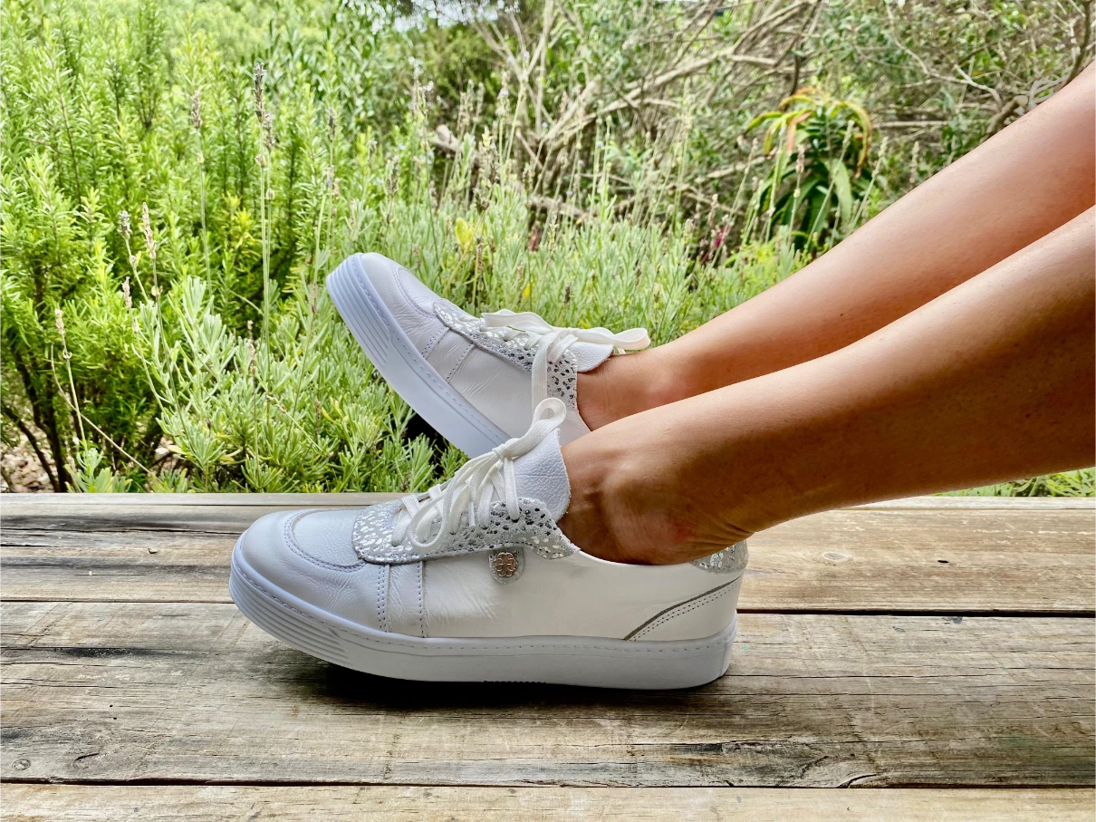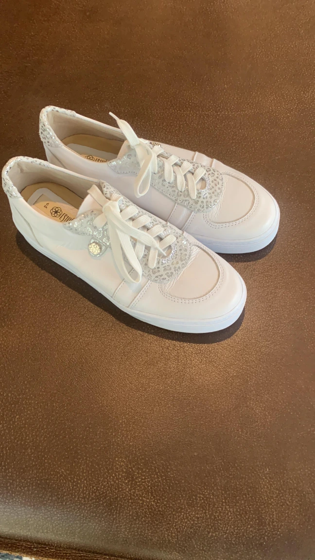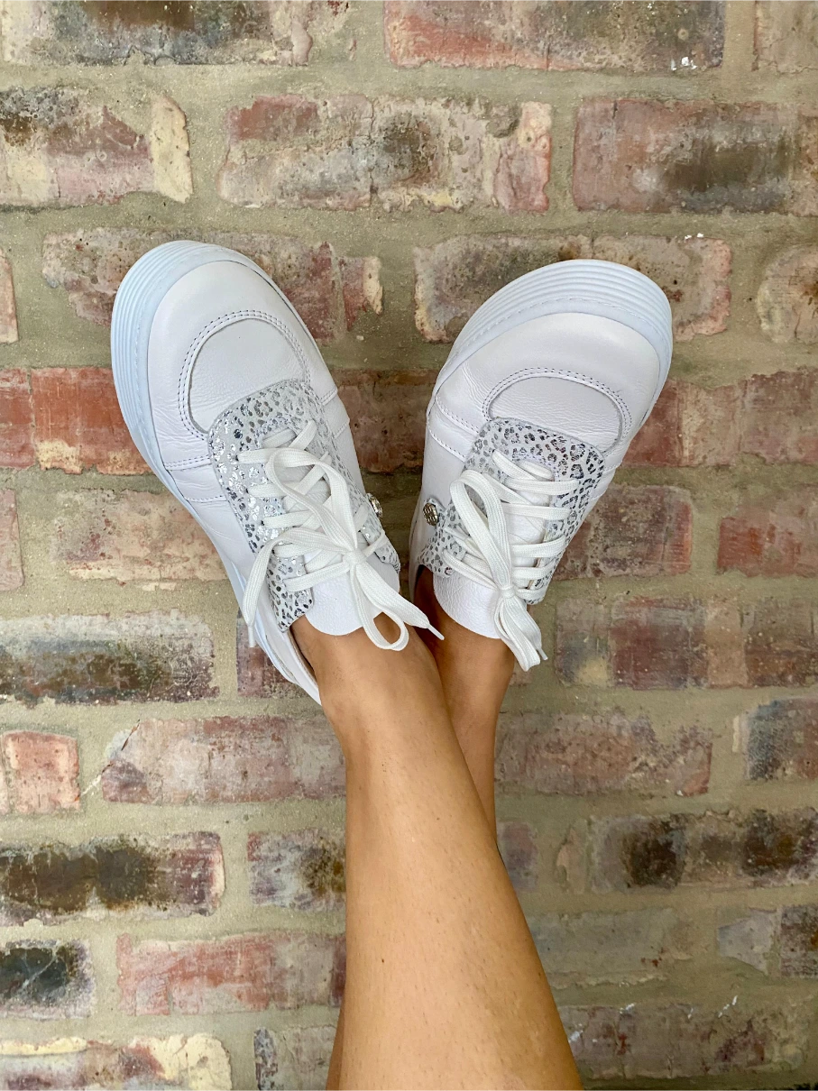 This leather sneaker features a buttery leather lining, a soft insole for all-day wear, and a beautiful silver animal-like accent that adds just the right edge.